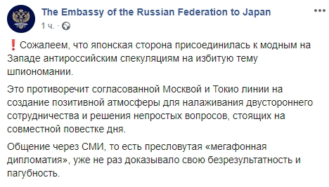 Российское диппредставительство в Японии с сожалением восприняло решение Токио присоединиться к модным на Западе антироссийским спекуляциям на избитую тему шпиономании.