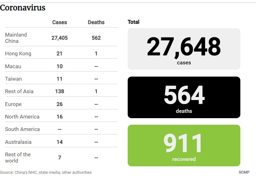 На территории материкового Китая выявлено 27 405 случаев заражения (+3757) и произошло 492 летальных исхода. В Гонконге инфицирован 21 человек (+3), на Тайване — 11 (+1), в Макао — 10 (0).