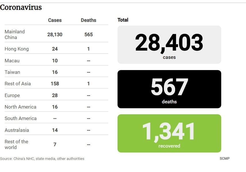На территории материкового Китая отмечено 28 130 случаев заражения и 565 летальных исходов. В Гонконге болеют 24 человека (+3), на Тайване — 16 (+5), в Макао — 10 (0).