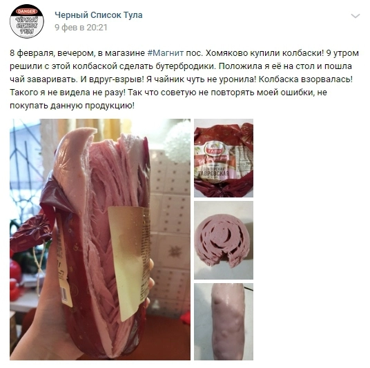 Утром решили с этой колбаской сделать бутербродики. Положила я ее на стол и пошла чай заваривать. И вдруг — взрыв! Я чайник чуть не уронила! Колбаска взорвалась! — написала женщина в группе «Черный список Тула» соцсети в «ВКонтакте».