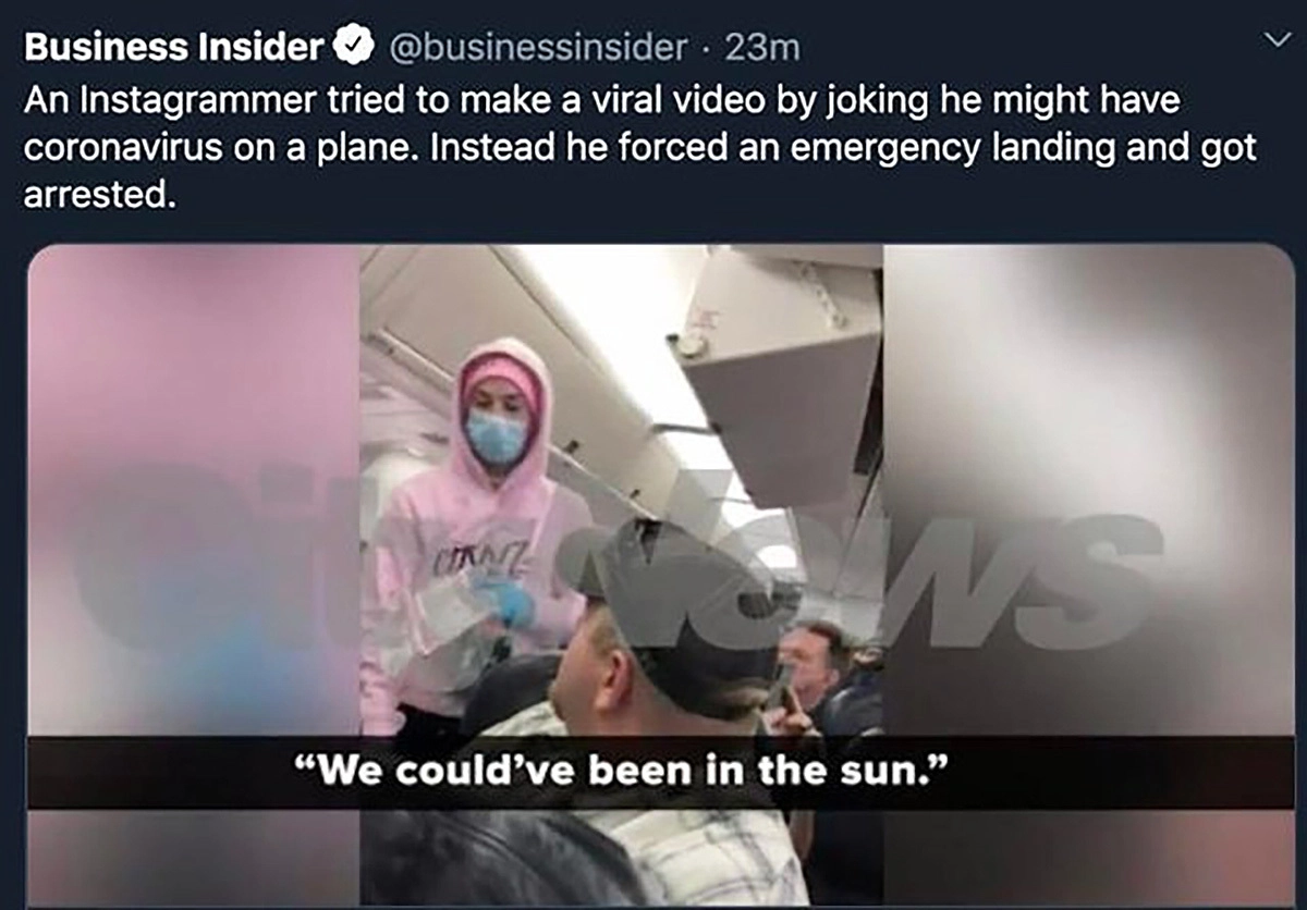 Канадский инстаблогер Джеймс Поток запустил вирусную блогошутку – он, летя из Торонто на Ямайку, встал в центре самолета и сказал: «Прошу вашего внимания. Я только что вернулся из провинции Хунань, столицы коронавируса. Я чувствую себя не очень хорошо. Спасибо за внимание». Шутка удалась: экипаж одел блогера в маску и перчатки, а самолёт развернули в Торонто. Российские блогеры подхватили начинание: по сети гуляет ролик, где молодой человек азиатской внешности в маске внезапно падает в вагоне метро и начинает дёргаться в судорогах.