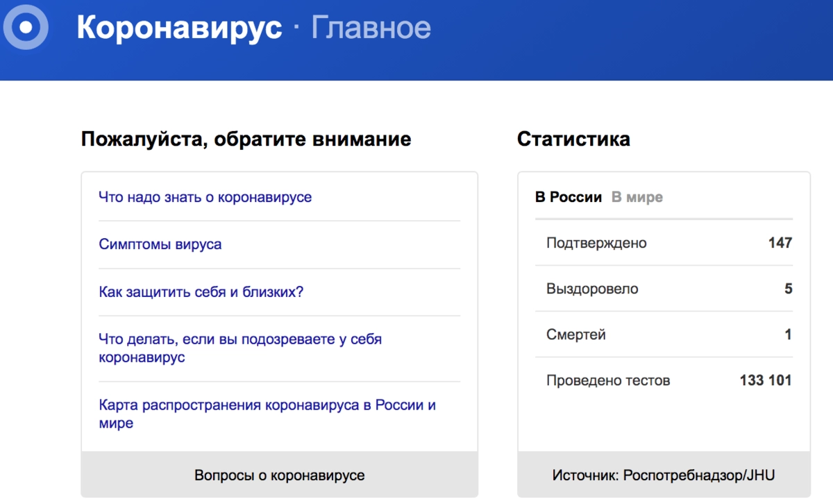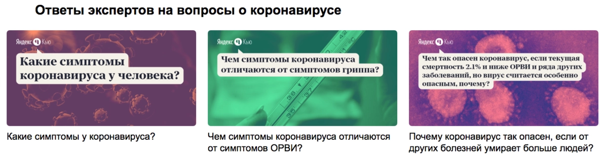 На сегодняшний день главная страница yandex.ru содержит информер региональных каналов оперативных штабов по коронавирусу с актуальными данными по субъектам РФ, в поисковике «Яндекса» появилась ссылка на наглядную карту распространения вируса в России и мире, а сервис вопросов и ответов «Яндекс.Кью» предлагает развернутые экспертные комментарии о вирусе и полезные советы о том, как защитить от COVID-19 себя и близких.
