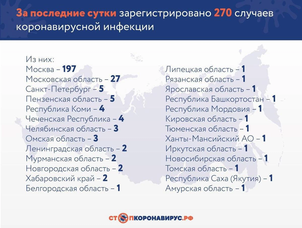 Оперштаб по борьбе с распространением коронавирусной инфекции опубликовал свежие данные по России. За последние сутки подтверждено еще 270 случаев заражения в 26 регионах, общее количество заболевших составляет 1534 человека.