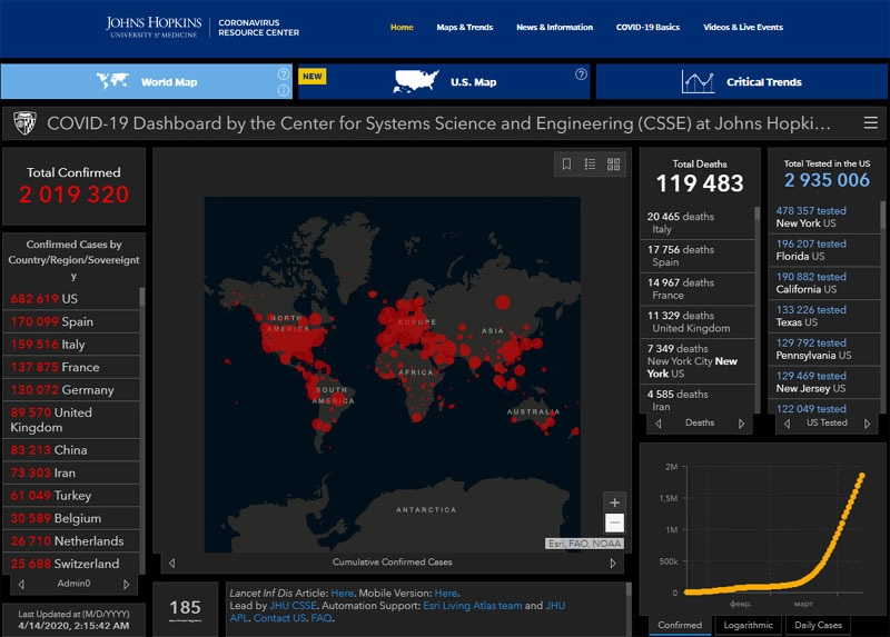 Всего за 12 дней число зараженных коронавирусной инфекцией в мире выросло с одного миллиона до двух. Сейчас, по данным Университета Джонса Хопкинса, на планете COVID-19 болеют 2 019 320 человек.