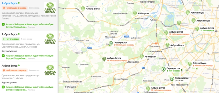 Как сообщает kp.ru, в проекте участвуют две общенациональные сети магазинов. На сегодняшний день к нему присоединились «Азбука Вкуса» и «Пятерочка». Очереди отображаются в 169 супермаркетах первой сети и 55 — второй в Москве и Санкт-Петербурге.