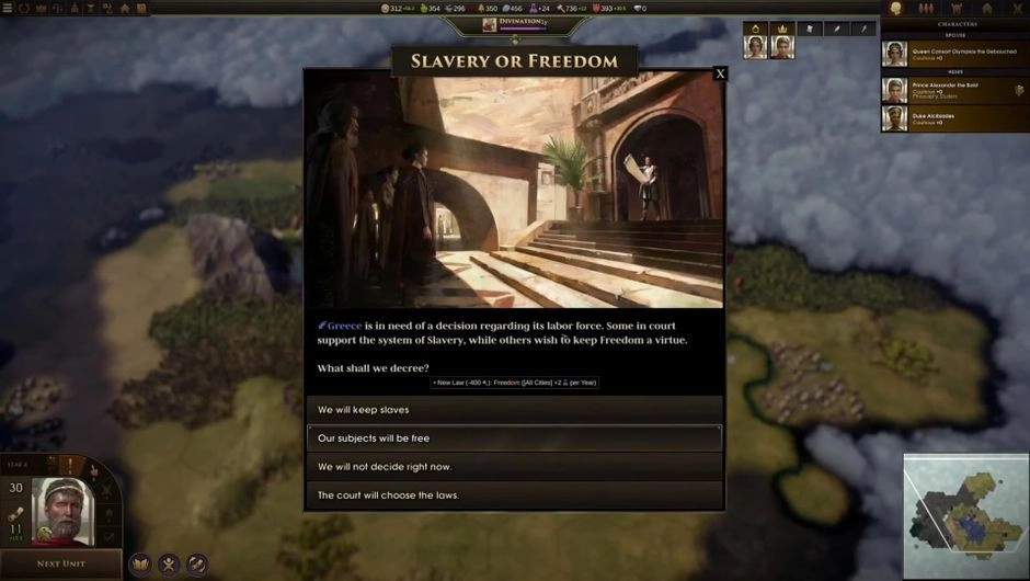 Так, нам будет доступно управление династическими линиями. Ваш герой будет стариться и умирать, однако на трон сядут уже его дети. В процессе управления государством нам придется не только исследовать мир и воевать, но и принимать множество разнообразных решений — например, о том, оставить работорговлю или нет.