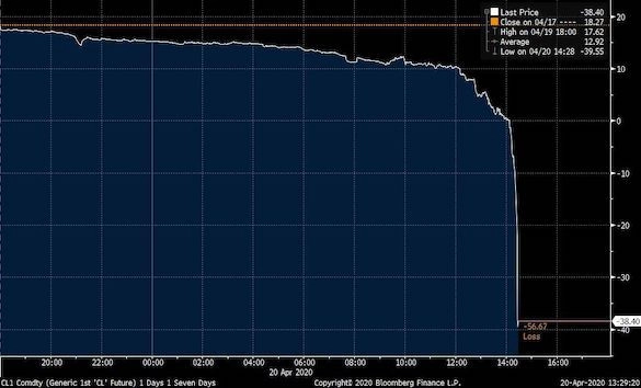 Впервые за всю историю торгов цена фьючерсного контракта на американскую нефть WTI упала ниже нуля. Впрочем, «упала» — это не лучшее слово, характеризующее то, что произошло с нефтью вчерашним вечером. Цены фьючерса на WTI с поставкой мае пробили нулевую отметку, подешевев на 300% до минус 38,4 доллара за баррель. Следом за WTI посыпались цены и в Европе. Спотовая цена российской Urals с поставкой на Северо-Запад ЕС также «пролетела» нулевую отметку, обвалившись до значения в минус 1,63 доллара за баррель.