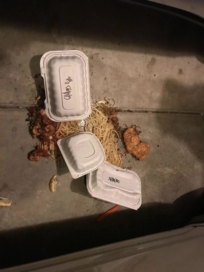 «Заказал еду навынос. Мало того, что соус вытек и запачкал мне сумку, так еще и, выходя из машины, я выронил все на пол»