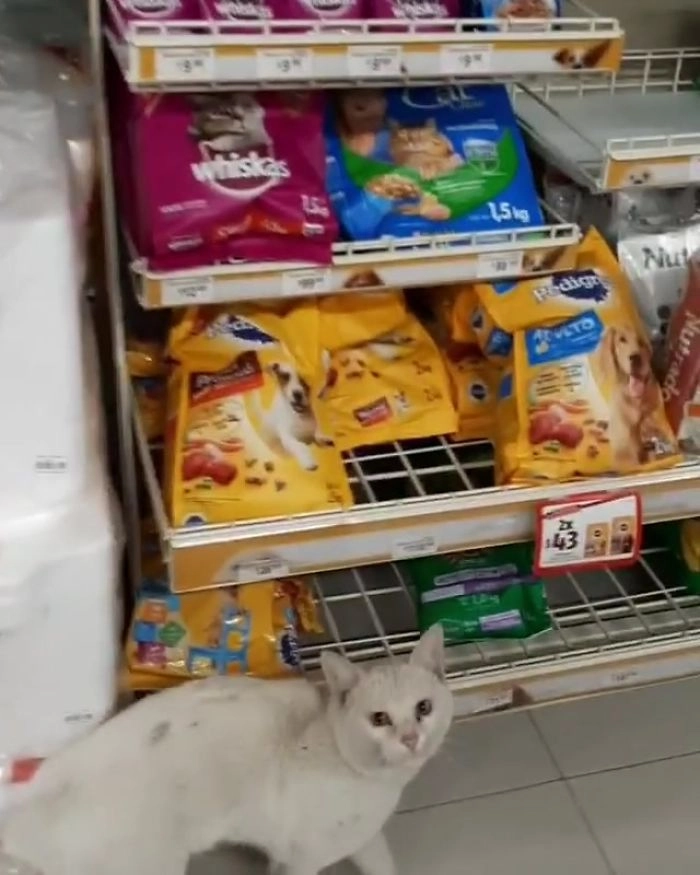 Оказалось, что котей вел ее туда не просто так, а чтобы показать, что ему нужна еда. Он подошел вместе с Таней к полке с кормами для животных и сделал выбор.