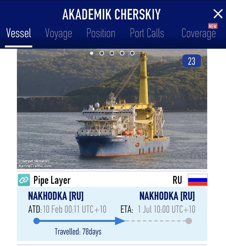Во время своего плавания «Академик Черский» постоянно меняет конечную точку маршрута. Недавно в качестве порта назначения был указан шотландский Абердин, затем Находка и, в конце концов, Калининград. На пути к нему судно пройдет в районе незавершенного строительства газопровода «Северный поток — 2».