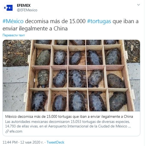 Гигантская партия черепах, которых контрабандой пытались вывезти в Китай, была задержана таможенниками в аэропорту Мехико. Некоторые виды этих животных находятся под угрозой исчезновения и подлежат особой защите. Однако владельцы груза засунули их в тесные коробки без воды и питания. В результате погибли более 260 особей.