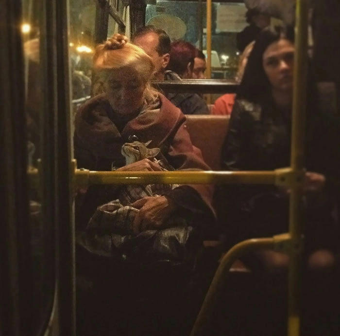 «Женщина и ее кошка в автобусе. Во взгляде животного столько любви»