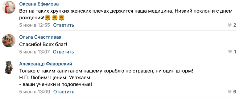 «Самые тяжелые больные — все мои». Так говорит Наталья Петровна Шень — хрупкая и мужественная женщина, врач, ученый, о своей работе. Как главный анестезиолог-реаниматолог Тюменской области она бывает во всех реанимационных палатах региона, консультирует, спасает, лечит. Сегодня у Натальи Петровны день рождения, и я ее от всей души поздравляю! — написал Моор в соцсетях.