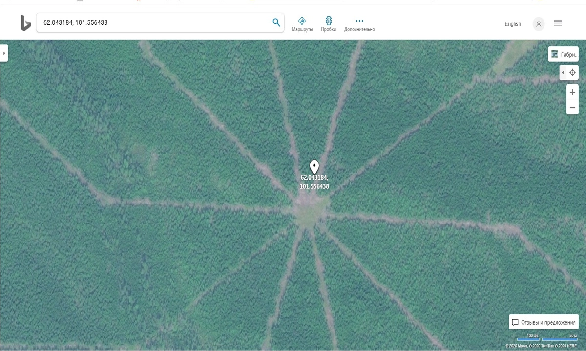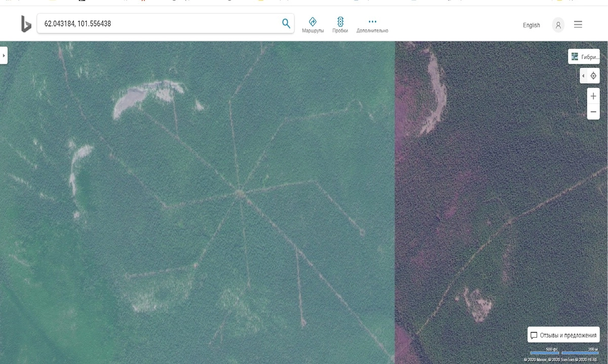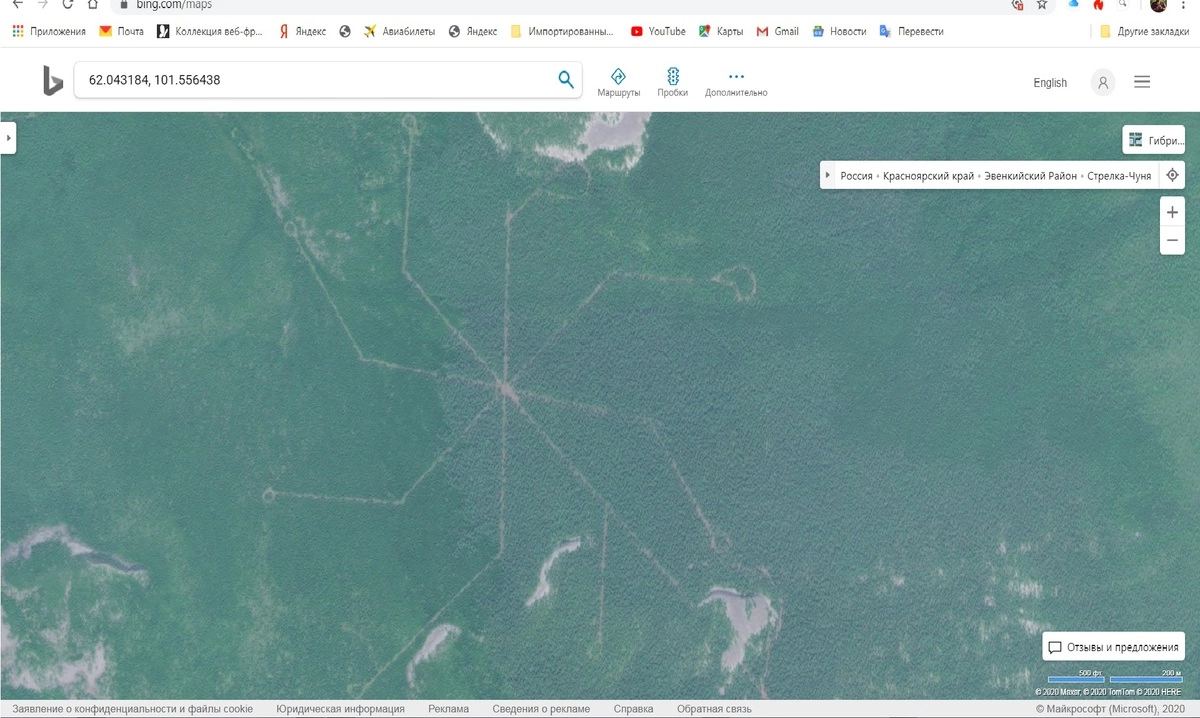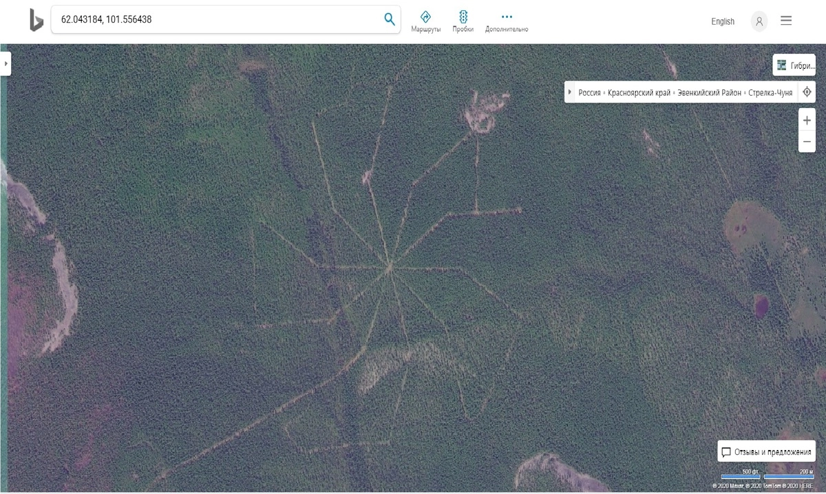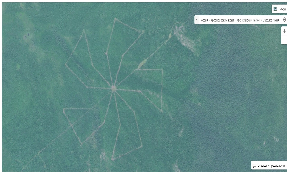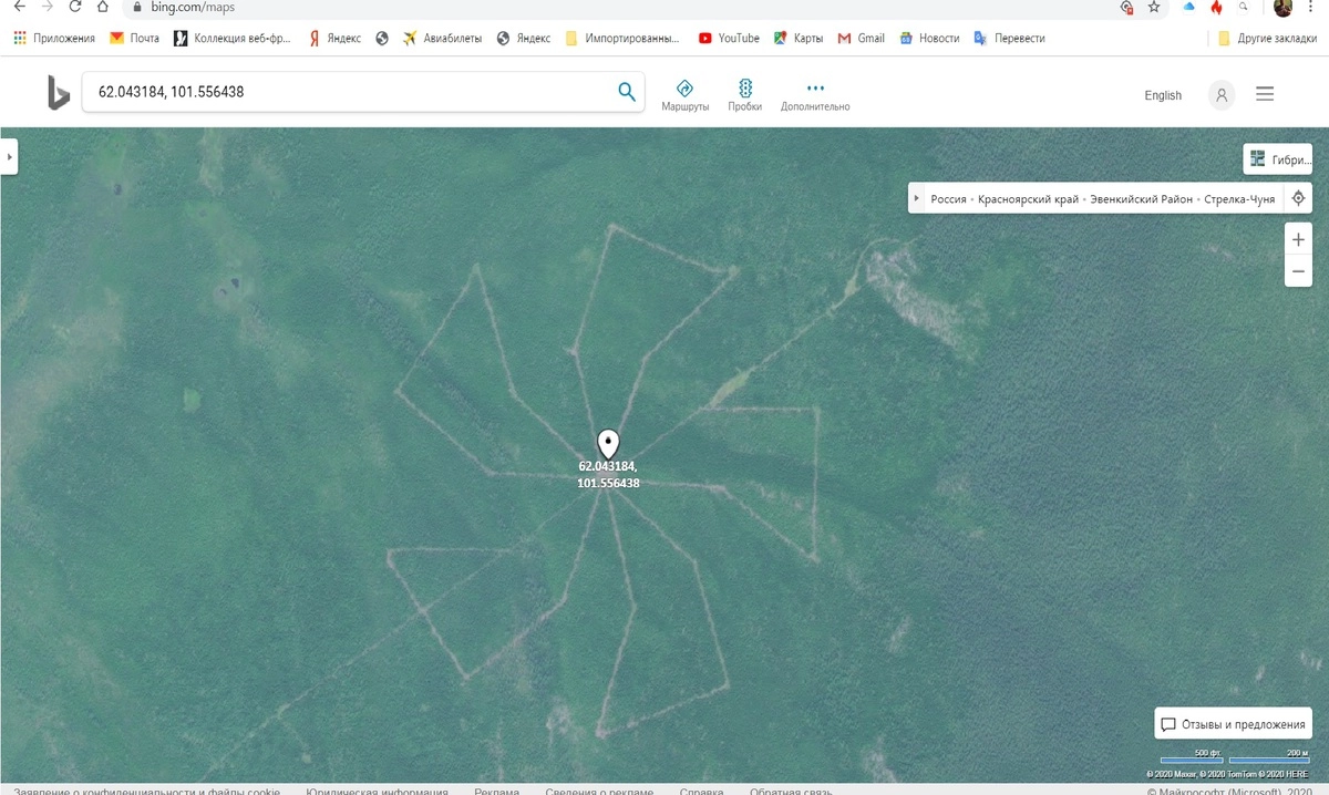 Координаты моей виртуальной находки следующие: Красноярский край, Россия. Координаты: 62.043184, 101.556438. Все вместе, огромные рисунки образуют великую сибирскую систему геоглифов. Детальные спутниковые снимки НАСА доказывают, что они были нанесены на грунт до того, как там появились деревья, и образовалась тайга.