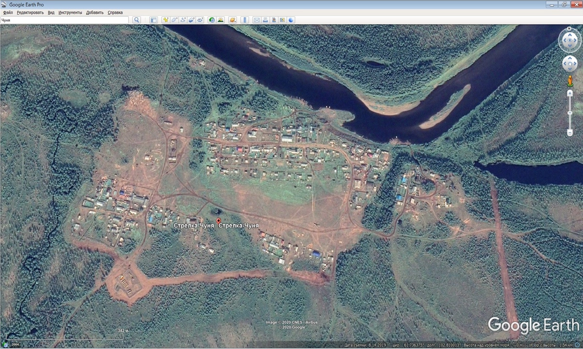 Теперь немного подробностей. Единственный населенный пункт в этих глухих местах, это поселок Стрелка-Чуня координаты: 61.739608°, 102.801881.° Это бывшая торговая фактория. Поселок был населен охотниками, тут происходила приемка пушнины, поэтому жили тут одни охотники. Сейчас в поселке всего проживает 183 человека. Никаких промысловых объектов, буровых вышек или карьеров там нет, да и не было их там никогда.