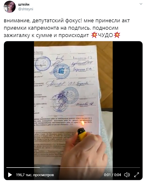 Оба общественных деятеля опубликовали в соцсетях видеоролики, в которых цифры расходов на ремонтные работы, проставленные, казалось бы, обычной авторучкой, исчезают, стоит лишь нагреть документ зажигалкой. Такую инновацию они обнаружили в работе московских строительных компаний, получающих подряды на капремонт.