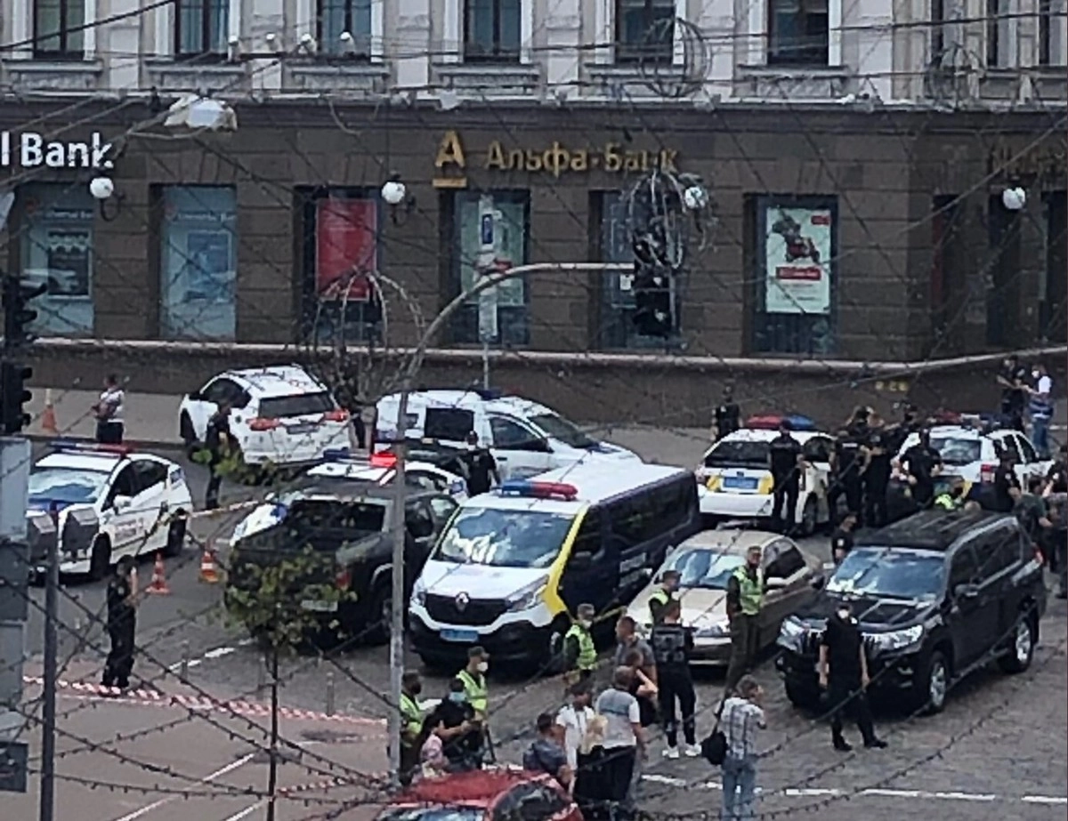 О террористе пока ничего не известно. На вид мужчине 35 лет. В Киеве введена в действие специальная полицейская операция «Гром».