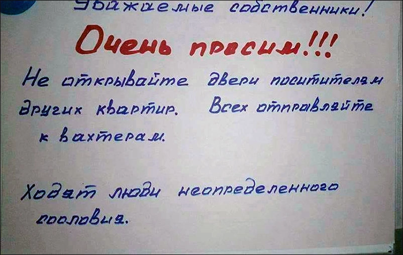 Русский менталитет, смекалка и чувство юмора проявляются во всех сферах жизни. Объявления из нашего материала — очередное тому доказательство. Их авторы решили избежать формальностей и донести информацию необычным и забавным способом. Как ни странно, у них это прекрасно получилось!