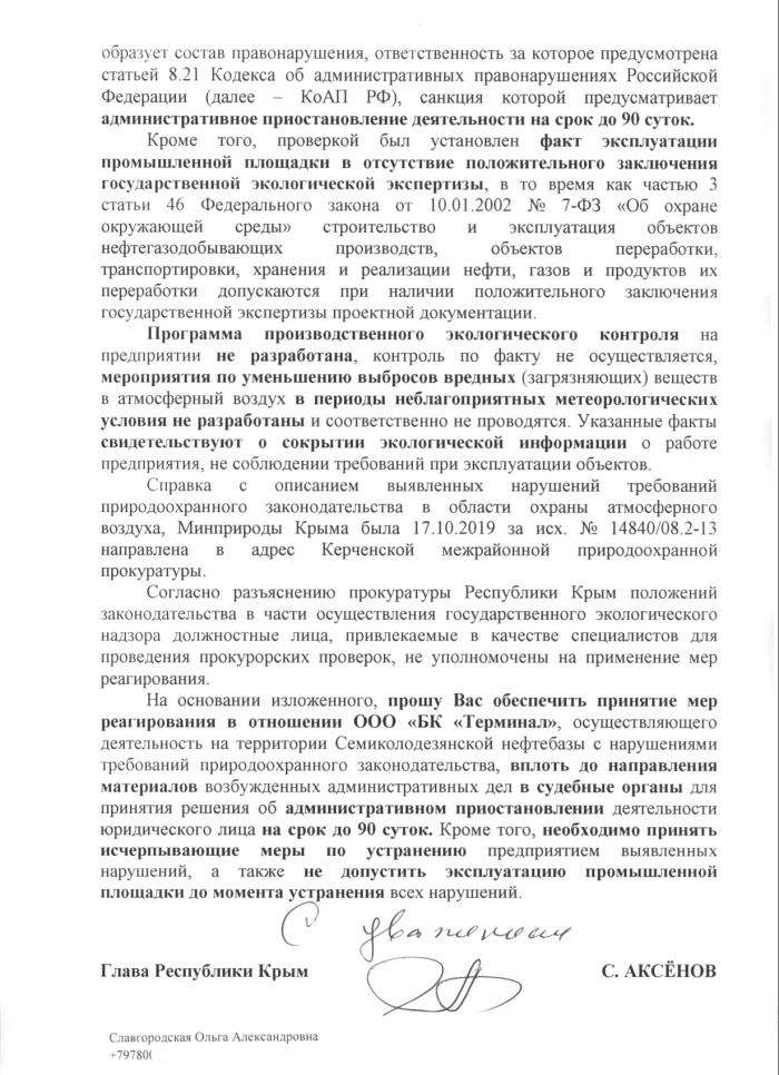 В Крыму природоохранные ведомства не смогли выполнить поручение Сергея Аксёнова по получению положительного заключения государственной экологической экспертизы при эксплуатации объектов Семиколодезянской нефтебазы.