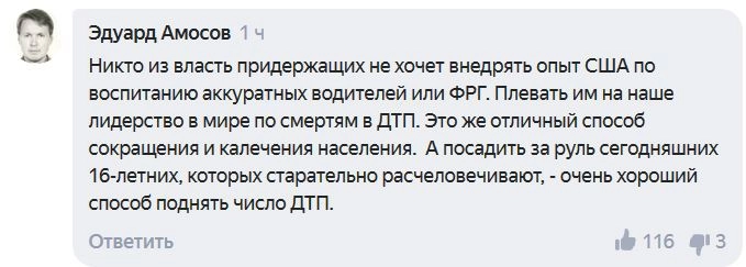 Еще один пользователь Сети переживает за количество ДТП, которое, по его мнению, значительно возрастет из-за подростков-водителей.