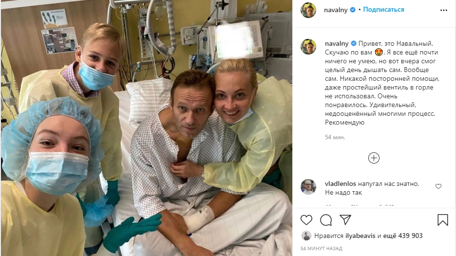 Общественный деятель и блогер Алексей Навальный, переживший кому, опубликовал в Instagram первый пост, в котором рассказал о своем самочувствии. На опубликованном фото с ним его жена и двое детей.