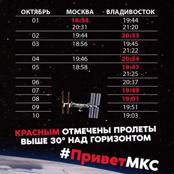 «Россия, вновь встречай МКС на ночном небе! На большей части нашей страны начинается очередной сезон видимости пролетов Международной космической станции! И мы снова можем передать привет МКС и помахать рукой „жителям“ орбитального дома — Ивану, Анатолию и Крису», — написала пресс-служба «Роскосмоса» в Telegram.