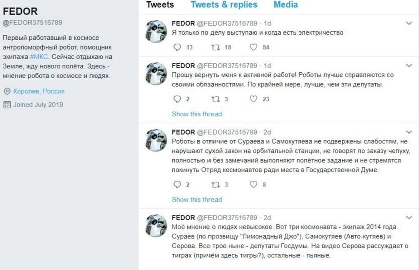 Вскоре после этих публикаций аккаунт робота-«правдоруба» был удален из Twitter. Впрочем, многие пользователи Рунета сочувствуют Федору. Они убеждены, что неизвестный, вещавший в соцсетях от его имени, писал о космической отрасли «по делу».