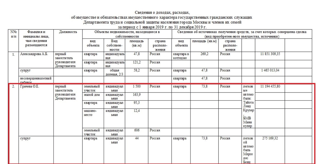 Из декларации Грачевой, опубликованной на официальном сайте мэра Москвы, следует, что в прошлом году она получила доход в 11 194 455,80 рубля. В ее собственности находится земельный участок площадью 1500 квадратных метров, жилой дом (почти 164 квадратных метра) и квартира площадью 95,3 квадратных метра.