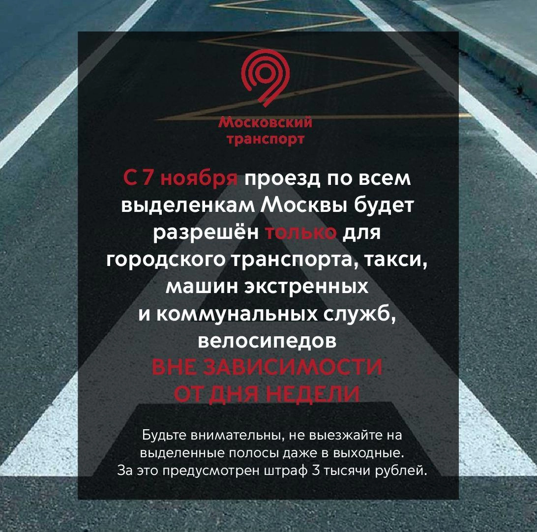 В столичном департаменте транспорта объявили, что с 7 ноября вне зависимости от дня недели проезд по всем выделенкам Москвы будет разрешен только для городского транспорта, такси, машин экстренных служб (пожарные, полиция, скорая), автомобилей коммунальных служб и велосипедов.