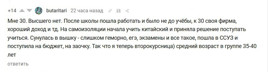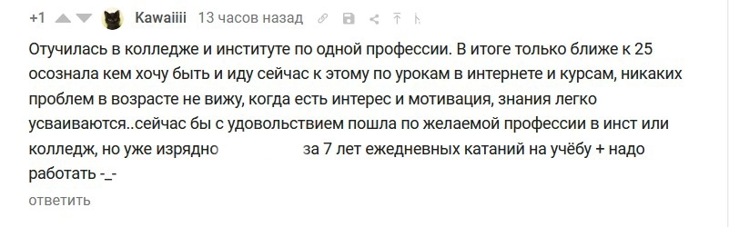 В ответ на историю девушки многие комментаторы поделились своими рассказами о том, что учиться и заниматься тем, чем хочется, никогда не поздно.