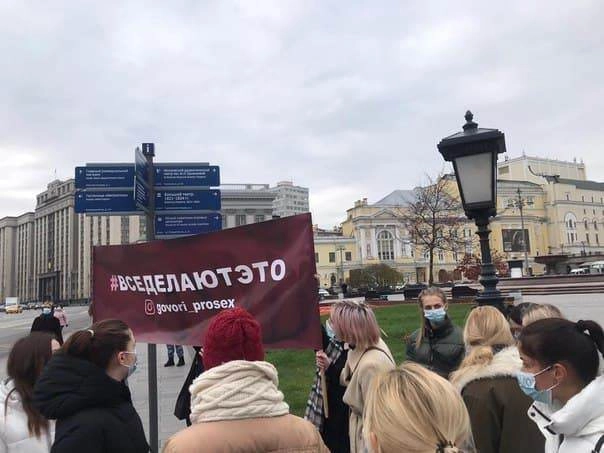 Акции организовали девушки из «Первой женской академии», занимающейся помощью в развитии инфобизнеса для женщин. Выйдя к Большому театру, они надели маски и развернули плакаты-перетяжки с надписями «#секснакарантине», «#нестыдно» и «#ямыдзюба».