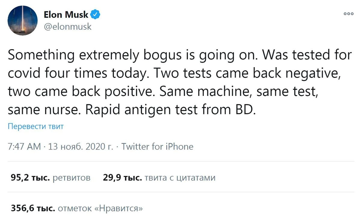 «Происходит какая-то полная ерунда. Сегодня у меня взяли четыре теста на коронавирус. Два теста дали отрицательный результат, два — положительный. [Был использован] антигенный экспресс-тест от [компании] BD», — написал предприниматель в Твиттере.