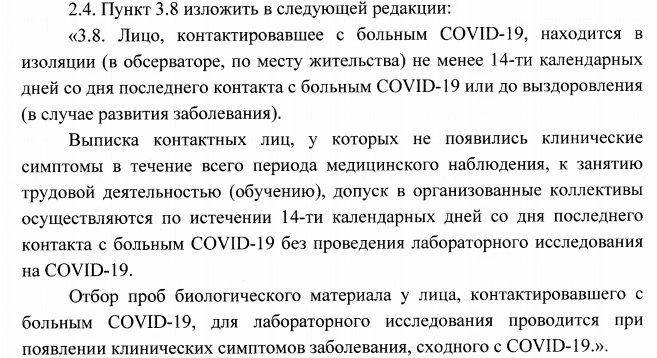 Согласно постановлению, «выписка контактных лиц, у которых не появились клинические симптомы в течение всего периода медицинского наблюдения», осуществляется «без проведения лабораторного исследования на COVID-19».