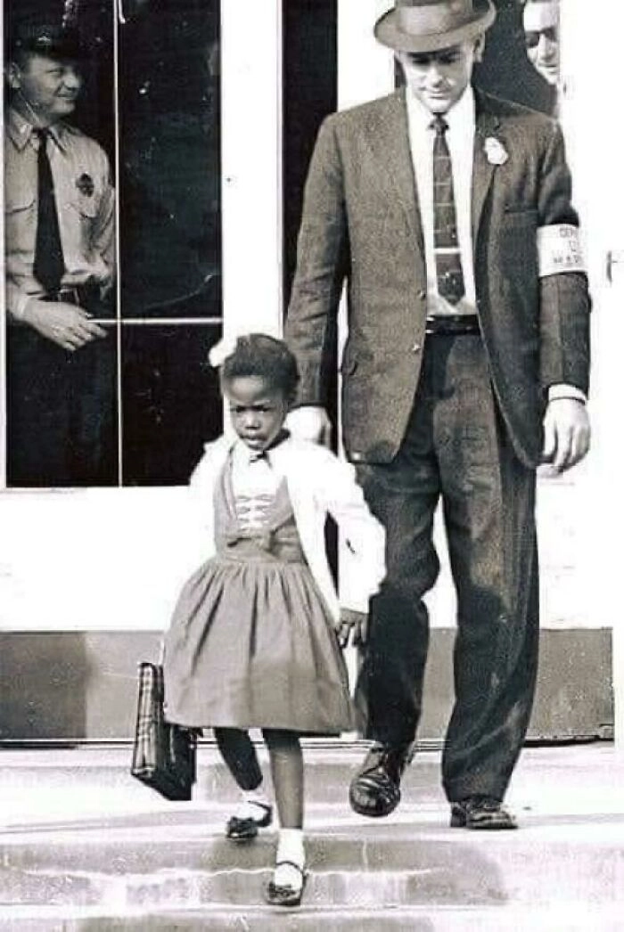 Охранник сопровождает шестилетнюю Руби Бриджес на выходе из школы. Девочка стала первым темнокожим ребенком, посетившим школу для белых