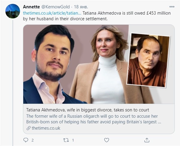 Напомним, что супруги состояли в браке десять лет, но в 2016 году решили развестись. Тогда Татьяна Ахмедова отсудила у бывшего мужа 453 миллионов фунтов стерлингов (это порядка 45,7 миллиардов рублей — прим. ridus.ru). В истории Великобритании это самая крупная сумма, которую женщине удалось выиграть по суду при разводе.