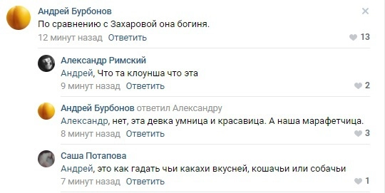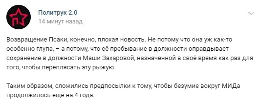 Пользователи Рунета часто сравнивают Псаки с официальным представителем МИД РФ Марией Захаровой. В целом российские комментаторы сходятся на том, что они стоят друг друга, а некоторые убеждены, что Захарову для того и назначили на ее должность, чтобы «переплясать эту рыжую».