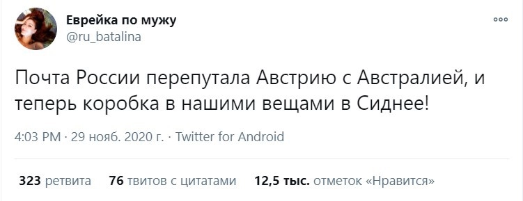 Девушка под ником ru_batalina поделилась в Twitter ситуацией, над которой хочется смеяться и плакать одновременно. Вещи, отправленные ей в Австрию, когда она переезжала, оказались в Австралии.