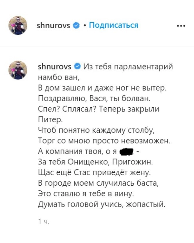 Создатель группы «Ленинград» Сергей Шнуров обвинил певца Василия Вакуленко, известного под псевдонимом Баста, в том, что из-за его последнего концерта в Санкт-Петербурге, где были нарушены санитарные правила по COVID-19, город закрыли для туристов на новогодние каникулы. Свое возмущение Шнуров выразил в стихотворной форме.