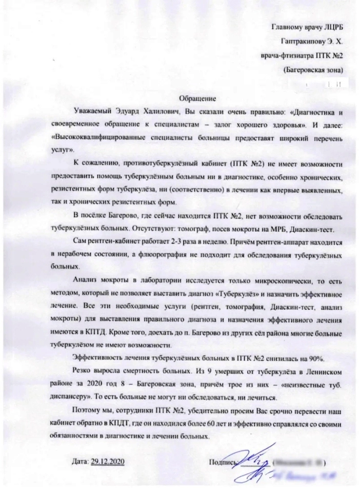 Медработники лично обращались по этому вопросу к главврачу Эдуарду Гаптракипову, однако ничего, кроме обещаний они от него не дождались. «Он нас выслушал и пообещал вернуть кабинет в Керченский диспансер. Правда, потом Гаптракипов забыл про обещание и не обращал внимания на наши последующие обращения», — сообщили «Ридусу» работники противотуберкулёзной службы.