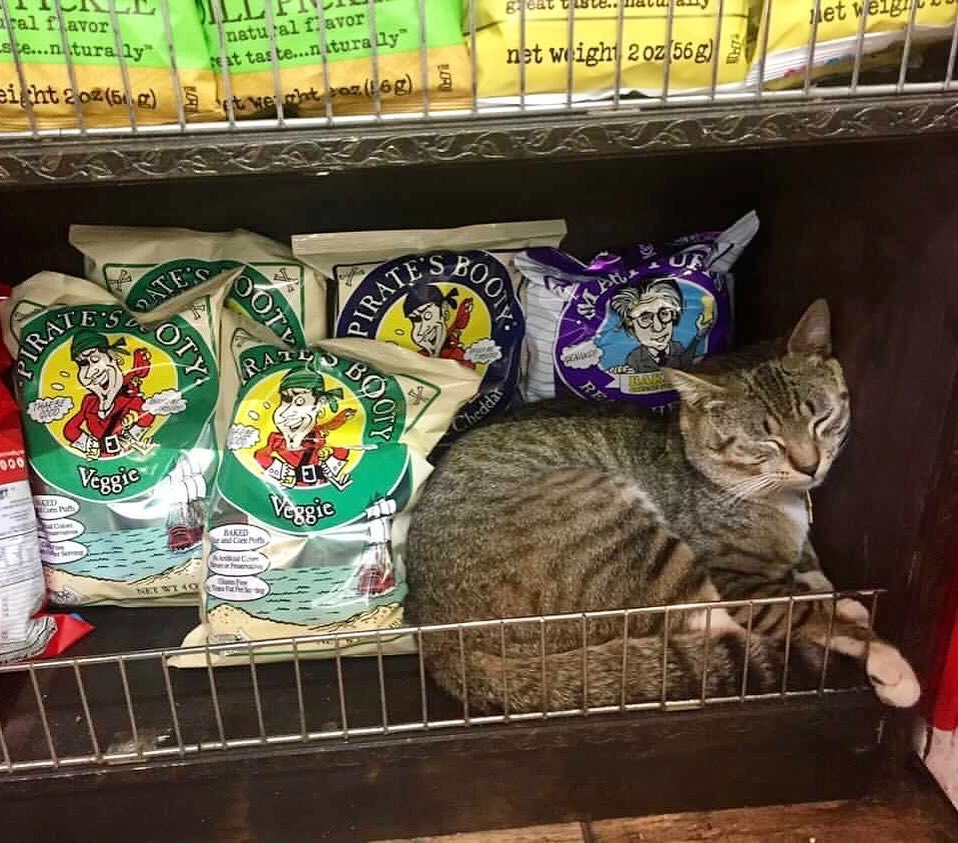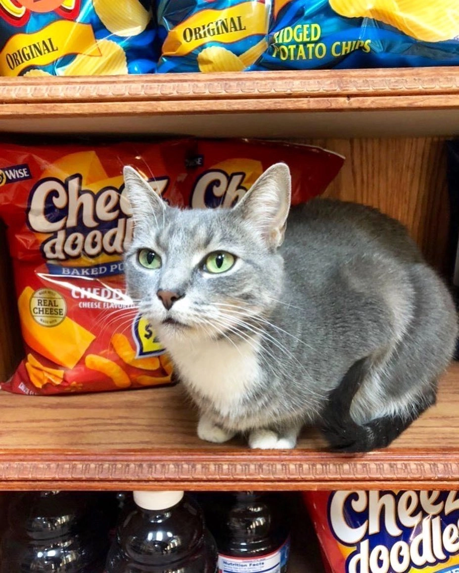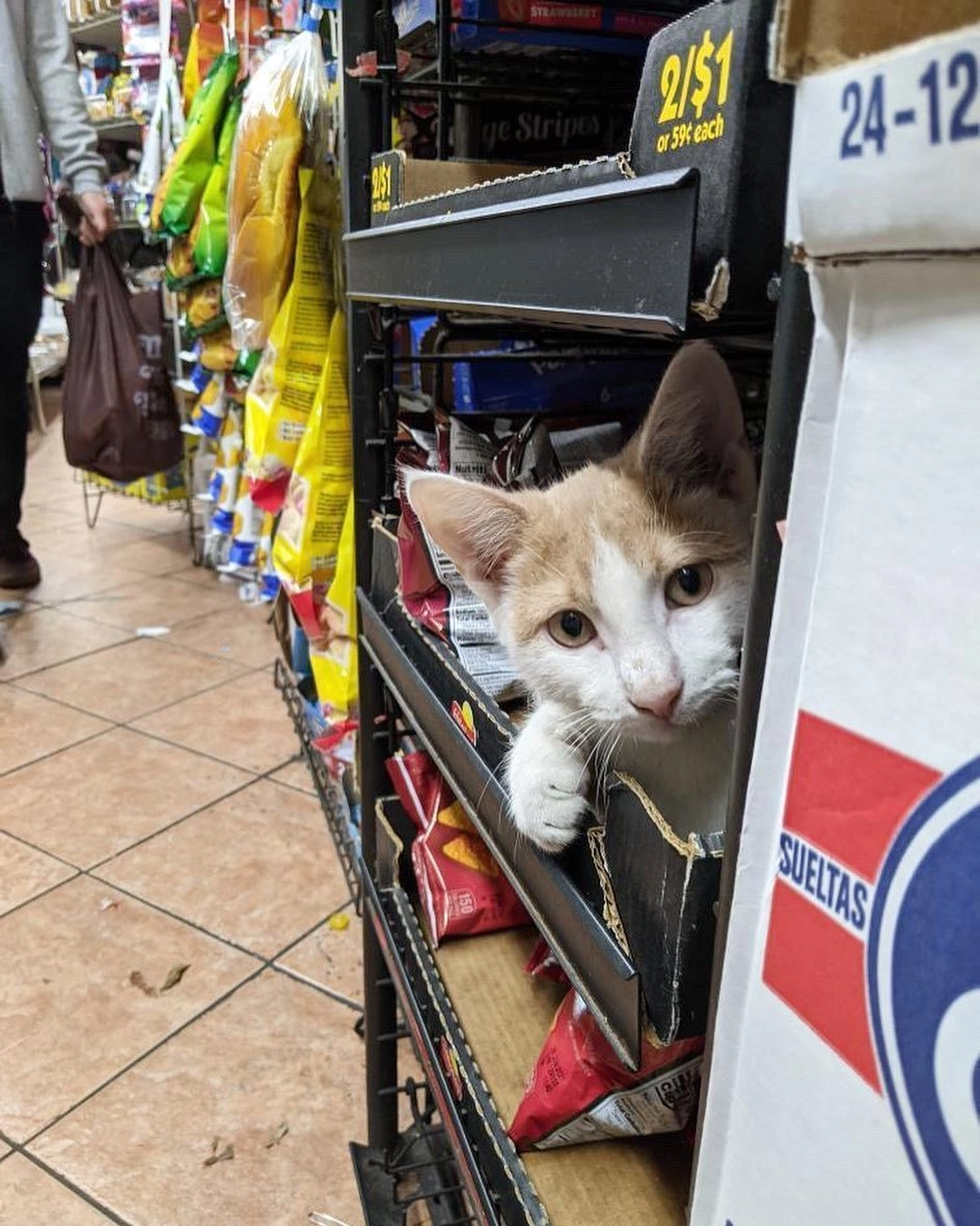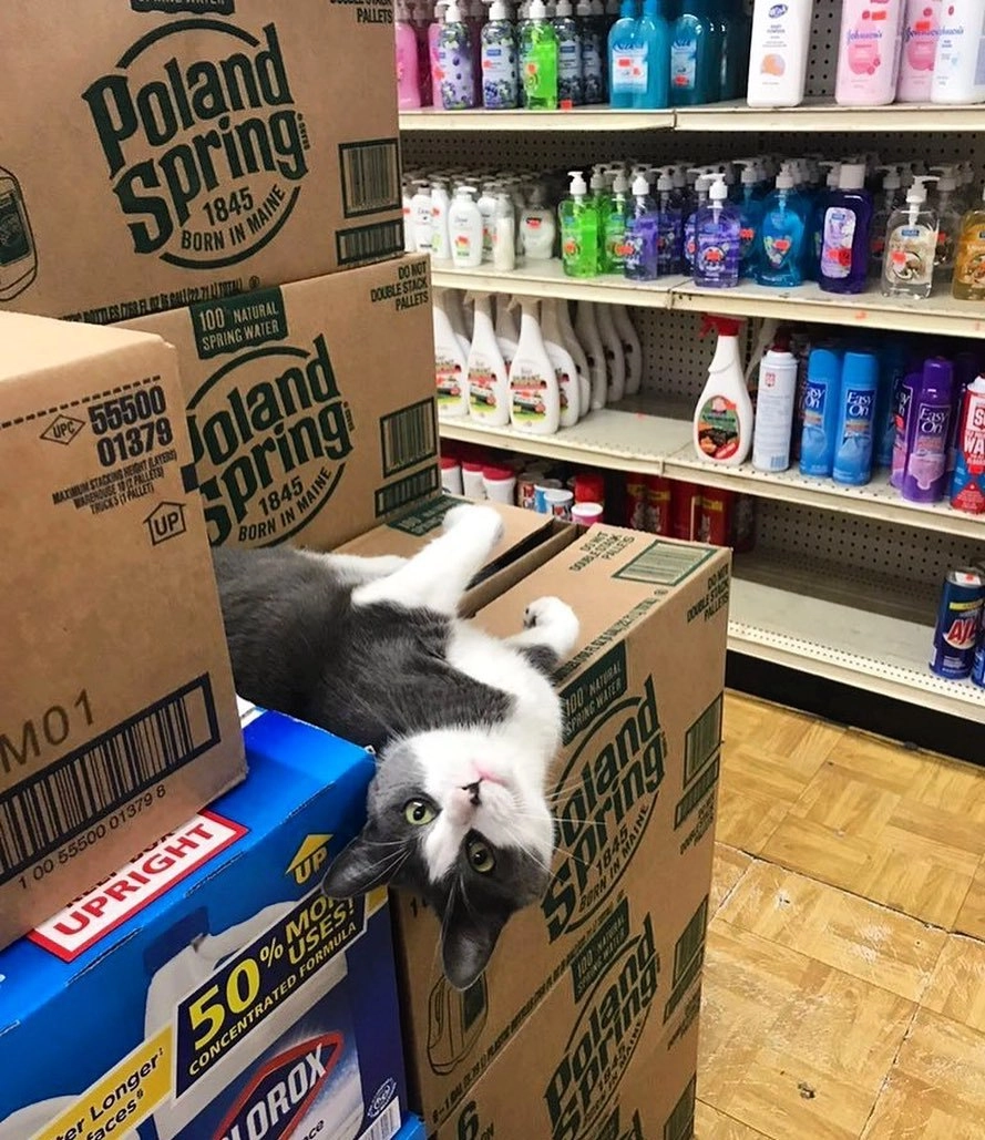 Кошки — достаточно своенравные животные, которые гуляют там, где захочет их вольная душа. И частенько душа тянет котов в супермаркеты и круглосуточные магазины, где можно найти сотни мест для отдыха, начиная с полок для хлеба и заканчивая комфортабельными коробками.