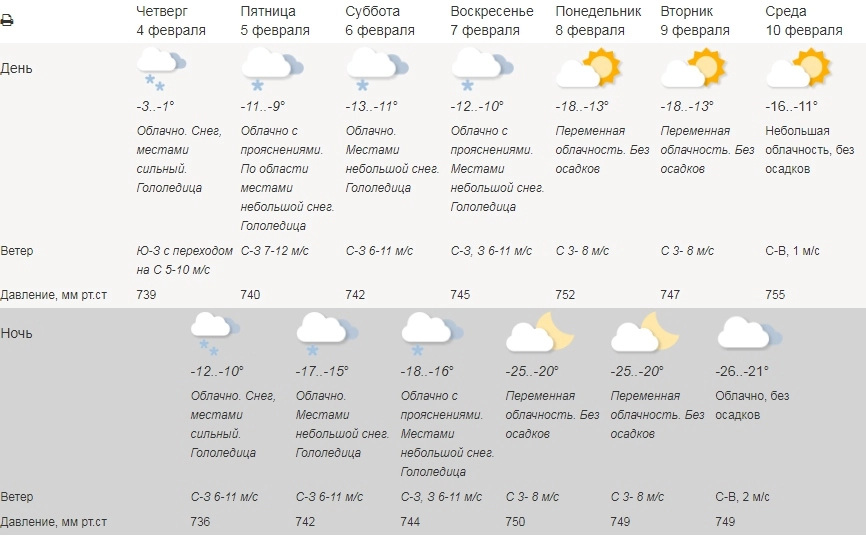 «Ночные температуры — минус 20−25 градусов, дневные — минус 13−18 градусов. Давление будет повышаться. В субботу и воскресенье облачная погода, местами снег, а в начале следующей неделе солнышко», — цитирует РИА Новости слова Вильфанда.