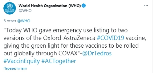 «Сегодня ВОЗ одобрила к экстренному применению две версии вакцины Оксфордского университета и AstraZeneca, дав „зеленый свет“ на использование этих препаратов во всем мире в рамках COVAX», — сказано в сообщении пресс-службы организации.
