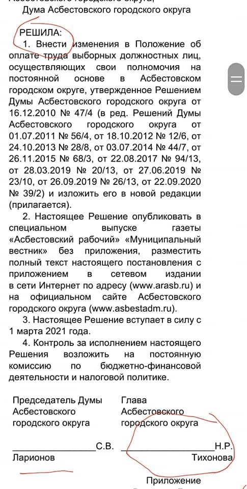 Депутаты городской думы города Асбест в Свердловской области обвинили мэра Наталью Тихонову в попытке поднять себе и спикеру думы Ларионову заработную плату до астрономической суммы с учетом всех надбавок. Об этом стало известно ridus.ru.