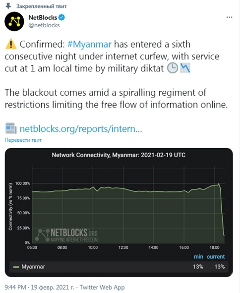 По данным NetBlocks, интернет в Мьянме работает со сбоями с 14 февраля.
