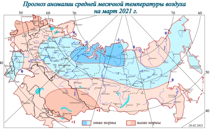 На сайте Гидрометцентра отмечается, что средняя месячная температура воздуха в марте в России ожидается близкой к средним многолетним значениям. Примерно на один градус холоднее будет на севере Уральского федерального округа и Сибирского федерального округа. На один градус теплее — в Алтайском крае.