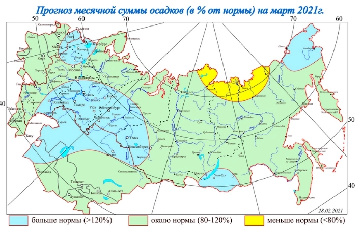 Близким к средним многолетним значениям будет и месячное количество осадков на большей части территории страны. Превышение нормы возможно в Ленинградской, Псковской, Новгородской, Тверской, Смоленской и Волгоградской областях, в Приволжском федеральном округе и Калмыкии, на юге Бурятии, на юге Забайкальского края и в Чукотском автономном округе. Чуть меньше обычного — на востоке Таймыра и севере Якутии.