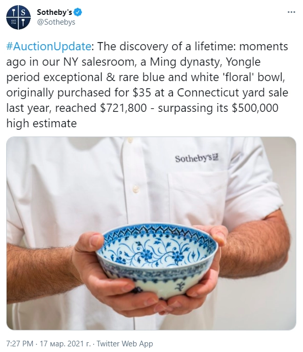 Китайская чаша 15 века, купленная на дворовой распродаже в американском штате Коннектикут за 35 долларов, ушла с молотка за 721,8 тысячи долларов.