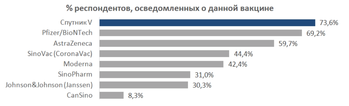 Исследователи также выяснили, что российский «Спутник V» является наиболее узнаваемой вакциной: о ней знают 74% респондентов. Российский «Спутник V» входит в топ-2 наиболее предпочитаемых вакцин после препарата Pfizer/BioNTech.