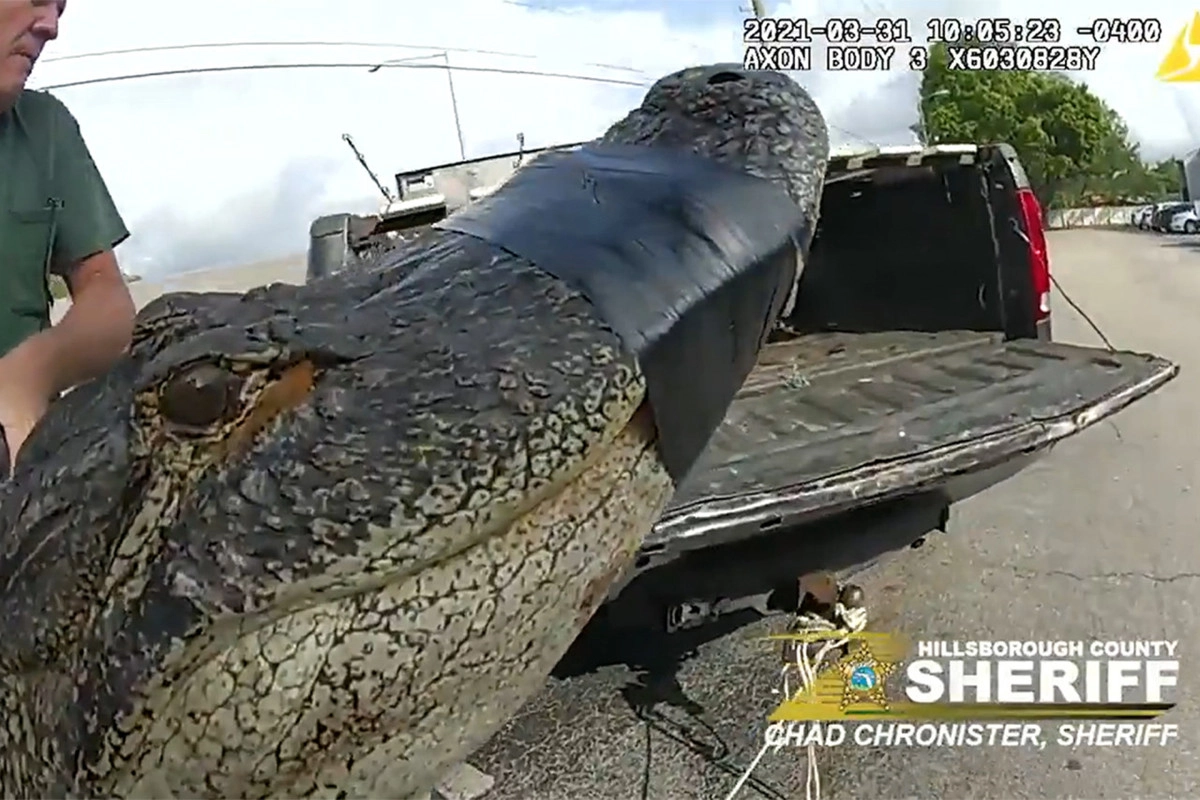 Гигантская рептилия не сопротивлялась и спокойно позволила трем мужчинам затащить себя в кузов грузовика. По данным полиции, сотрудники службы охраны дикой природы увезли животное на ближайшую ферму аллигаторов, пишет New York Post.