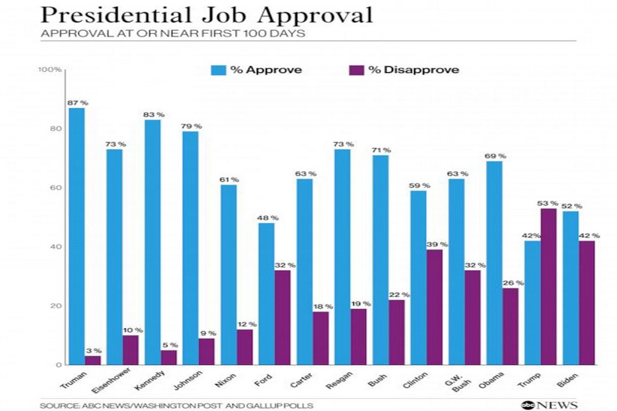 Согласно расчетам, 52% американцев одобряют работу Байдена, что ниже, чем любой его предшественник с 1945 года, за исключением Джеральда Форда в 1974 году (48%, после его непопулярного помилования Ричарда Никсона) и Дональда Трампа на 42% в 2017 году. Для 14 президентов от Трумэна до Байдена 100-дневный средний показатель составляет 66%.